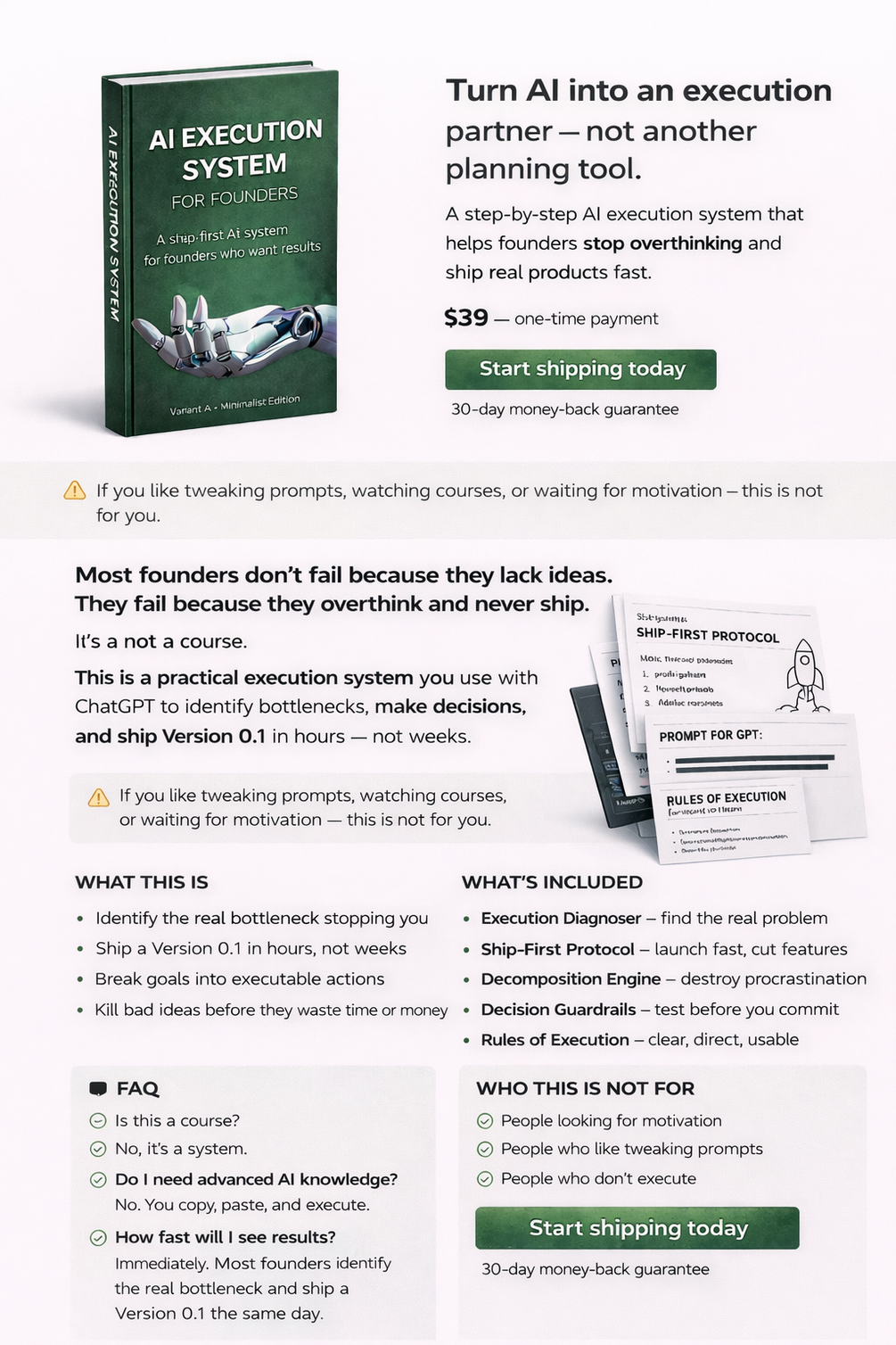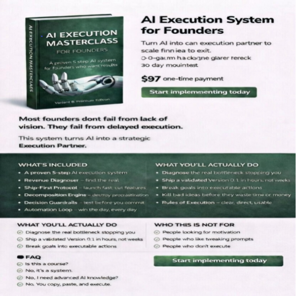 - ⚡ Action-First Strategy: This isn’t a course or a book. It’s a lean, mean execution machine designed to help you ship faster.
